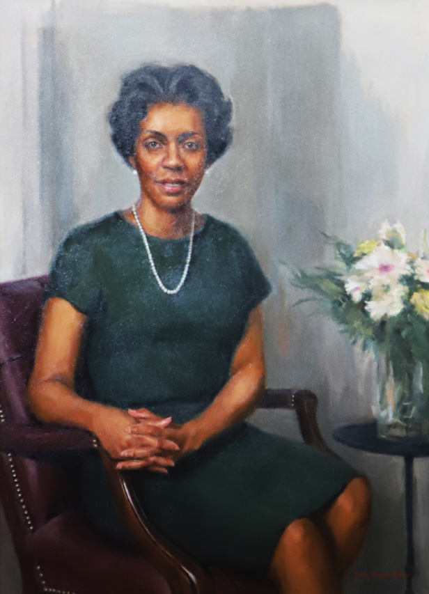 The oil-on-canvas painting, created by Houston artist and educator Eddie Filer Jr., features Saunders, wearing a green dress adorned with a pearl necklace, seated in a red leather chair with a nearby flower-filled vase. Lisa Fleming ’82, a retired attorney and member of Hanover’s Board of Trustees, commissioned the painting.
